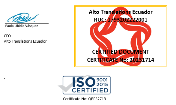 We, Alto Translations, officially registered as Alto Translations in Ecuador (RUC: 1793202222001. De la Torcaza 158. Cumbayá, Quito-Ecuador. +59397477925. info@altotranslations.com), and as an international company for professional translations, we hereby certify that the ENGLISH translations these documents from the original SPANISH documents are a true translation of the originals, to our best knowledge. This translation was independently verified and certified by Translation Point, registered translation agency, ISO Certified company 9001-2015 Certificate No: QBE32719, SEA Registration No: 2019077000. The internal procedures are listed here to maintain traceability of quality: