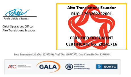 We, Alto Translations, officially registered as Alto Translations in Ecuador (RUC: 1793202222001. De la Torcaza 158. Cumbayá, Quito-Ecuador. +59397477925. info@altotranslations.com), and as an international company for professional translations, we hereby certify that the ENGLISH translations these documents from the original SPANISH documents are a true translation of the originals, to our best knowledge. This translation was independently verified and certified by “Zood Interpreters Ltd”, (Company Number: 12587388. England and Whales). The internal procedures are listed here to maintain traceability of quality: