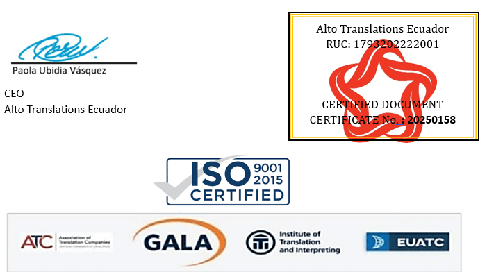 Para mayor verificación, por favor llame al +593980379029 o envíe un correo electrónico a info@altotranslations.com con el número de certificación a mano.