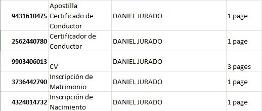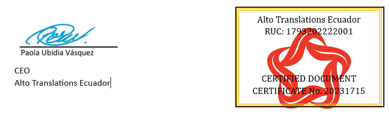 Die Originaldokumente wurden am 20. Dezember 2023 von Daniel Jurado unter der ID-Nr. 0602136350 direkt an unsere Büros in Quito geliefert, eigentümer dieser Dokumente und somit die Person, die für die Verwendung der Originaldokumente und der übersetzten Dokumente verantwortlich ist.