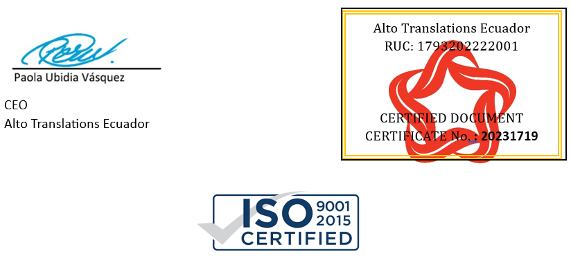 We, Alto Translations, officially registered as Alto Translations in Ecuador (RUC: 1793202222001. De la Torcaza 158. Cumbayá, Quito-Ecuador. +59397477925. info@altotranslations.com), and as an international company for professional translations, we hereby certify that the ENGLISH translations these documents from the original SPANISH documents are a true translation of the originals, to our best knowledge. This translation was independently verified and certified by Translation Point, registered translation agency, ISO Certified company 9001-2015 Certificate No: QBE32719, SEA Registration No: 2019077000.