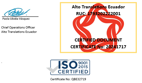 We, Alto Translations, officially registered as Alto Translations in Ecuador (RUC: 1793202222001. De la Torcaza 158. Cumbayá, Quito-Ecuador. +59397477925. info@altotranslations.com), and as an international company for professional translations, we hereby certify that the ENGLISH translations these documents from the original SPANISH documents are a true translation of the originals, to our best knowledge. This translation was independently verified and certified by Translation Point, registered translation agency, ISO Certified company 9001-2015 Certificate No: QBE32719, SEA Registration No: 2019077000. The internal procedures are listed here to maintain traceability of quality: