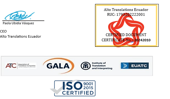 We, Alto Translations, officially registered as Alto Translations in Ecuador (RUC: 1793202222001. De la Torcaza 158. Cumbayá, Quito-Ecuador. +59397477925. info@altotranslations.com), and as an international company for professional translations, we hereby certify that the ENGLISH translations these documents from the original SPANISH documents are a true translation of the originals, to our best knowledge. This translation was independently verified and certified by «Translation Point» registered translation agency, ISO Certified company 9001-2015 Certificate No: QBE32719, SEA Registration No: 2019077000