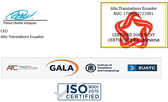 We, Alto Translations, officially registered as Alto Translations in Ecuador (RUC: 1793202222001. De la Torcaza 158. Cumbayá, Quito-Ecuador. +59397477925. info@altotranslations.com), and as an international company for professional translations, we hereby certify that the ENGLISH translations these documents from the original SPANISH documents are a true translation of the originals, to our best knowledge. This translation was independently verified and certified by «Translation Point» registered translation agency, ISO Certified company 9001-2015 Certificate No: QBE32719, SEA Registration No: 2019077000
