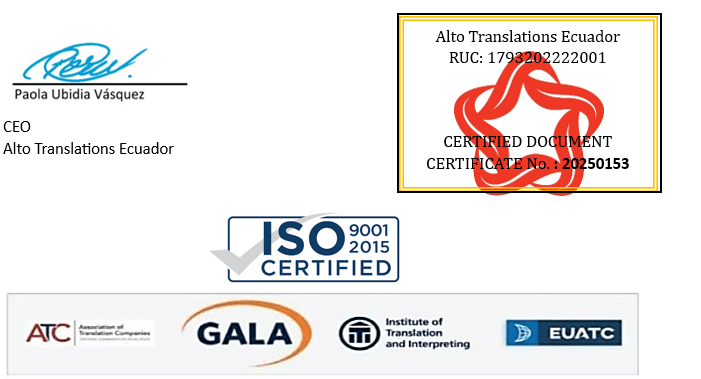 We, Alto Translations, officially registered as Alto Translations in Ecuador (RUC: 1793202222001. De la Torcaza 158. Cumbayá, Quito-Ecuador. +59397477925. info@altotranslations.com), and as an international company for professional translations, we hereby certify that the ENGLISH translations these documents from the original SPANISH documents are a true translation of the originals, to our best knowledge. This translation was independently verified and certified by «Translation Point» registered translation agency, ISO Certified company 9001-2015 Certificate No: QBE32719, SEA Registration No: 2019077000