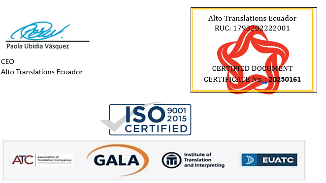 For further verification please call +593 9 8 037 9029 or email at info@altotranslations.com with the certification number at hand.