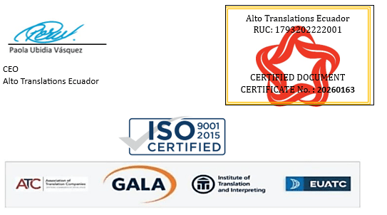 We, Alto Translations, officially registered as Alto Translations in Ecuador (RUC: 1793202222001. De la Torcaza 158. Cumbayá, Quito-Ecuador. +59397477925. info@altotranslations.com), and as an international company for professional translations, we hereby certify that the ENGLISH translations these documents from the original SPANISH documents are a true translation of the originals, to our best knowledge. This translation was independently verified and certified by «Translation Point» registered translation agency, ISO Certified company 9001-2015 Certificate No: QBE32719, SEA Registration No: 2019077000.