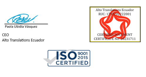 We, Alto Translations, officially registered as Alto Translations in Ecuador (RUC: 1793202222001. De la Torcaza 158. Cumbayá, Quito-Ecuador. +59397477925. info@altotranslations.com), and as an international company for professional translations, we hereby certify that the ENGLISH translation of document No. 6272008910 and 4270627715 from the original SPANISH document it is a true translation of the original, to our best knowledge. This translation was independently verified and certified by Translation Point. (Registered Translation Agency, ISO Certified company 9001-2015 Certificate No: QBE32719, SEA Registration No: 2019077000, India).